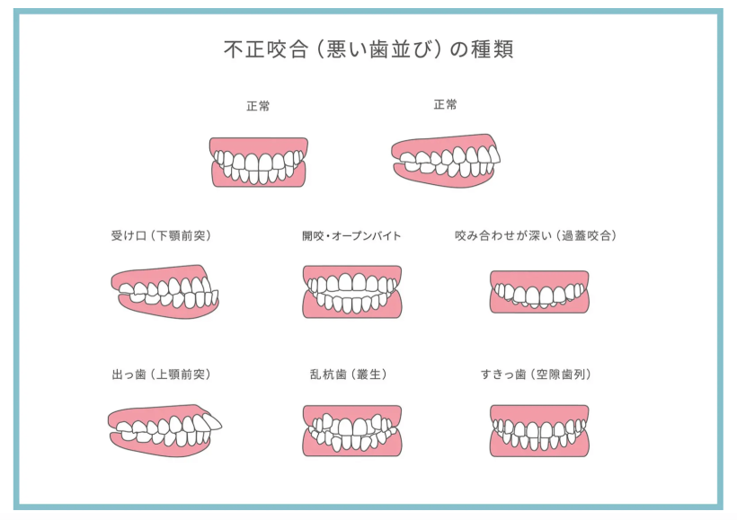 逆にそうでない状態を「噛み合わせが悪い」というわけです。上顎と下顎のずれ、歯ならびの乱れなどによって咬み合わせが得られない状態を「不正咬合」と言います。不正咬合は大きくわけて、以下のようなものが挙げられます。